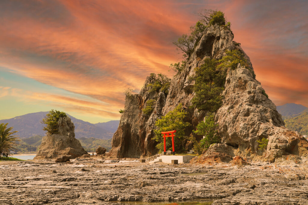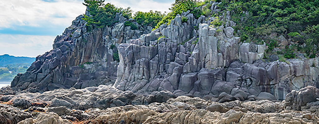 周囲約600m、南北200m、東西100mほどの小島・弁天島。南側に赤い鳥居と白蛇弁天を祀る祠があり、航海安全や商売繁盛、財運にご利益があるとして、古くから地域の漁民を中心に信仰されています。弁天島は、地層の中で熱い水の通り道だった場所。その熱の影響で周りの地層よりも硬く、浸食に強くなったため、細長くそそり立つように残りました。お蛇浦はより太平洋側にある海岸で、ここではもともと水平に溜まった地層が少し傾いています。