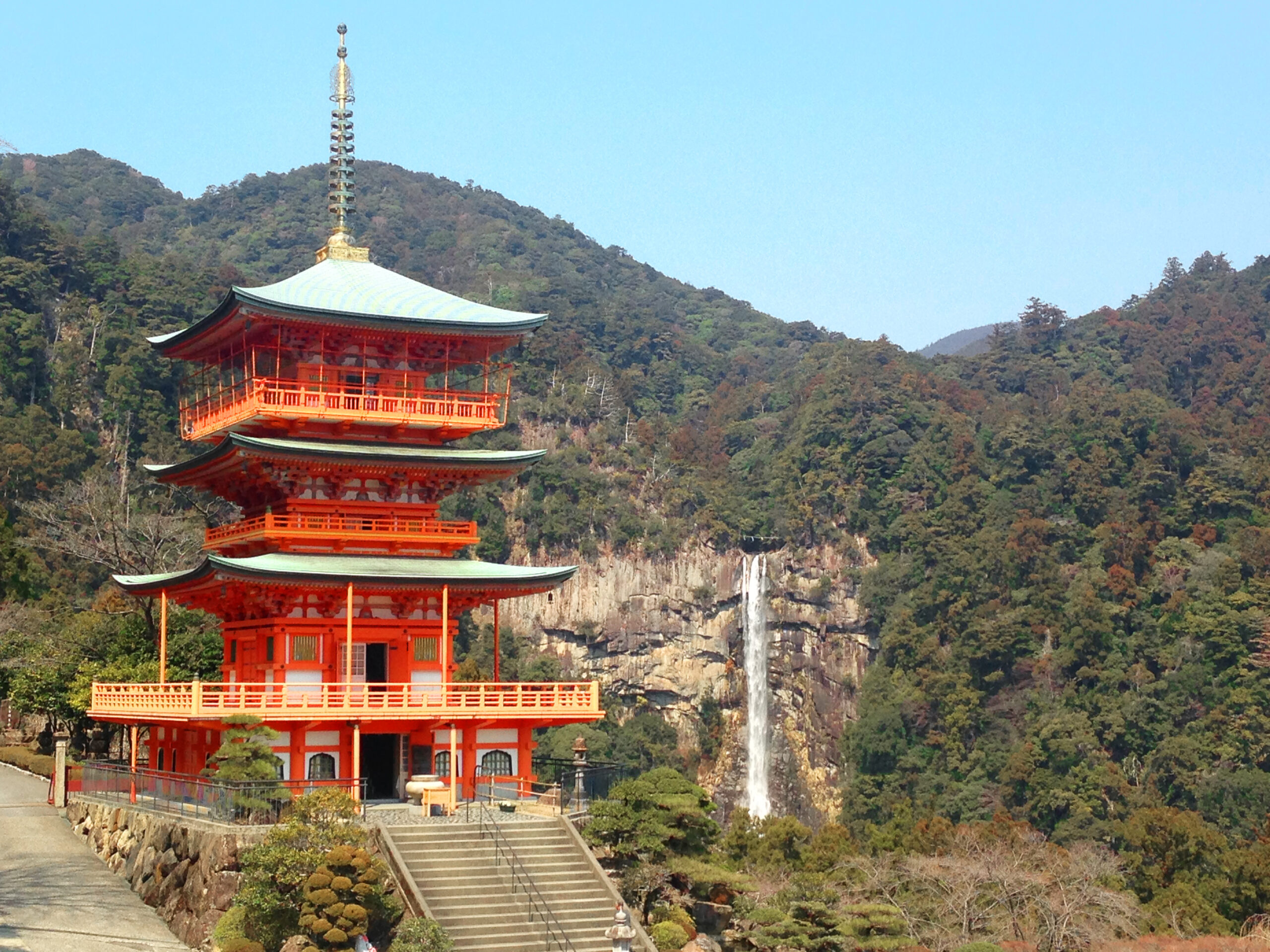 熊野那智大社や那智山青岸渡寺、那智滝(飛瀧神社)など世界遺産・紀伊山地の霊場と参詣道の登録物件が所在する那智山。全域が吉野熊野国立公園の一部であり、深い自然の山と森林が残されています。天気の良い日には、熊野カフェからも日本三名瀑の一つ・那智滝の姿を拝むことができます。